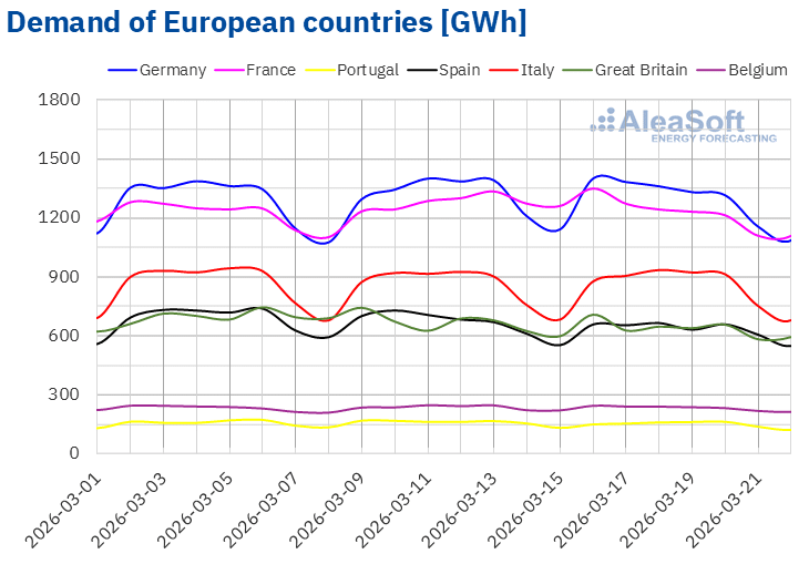 For the last week of March, AleaSoft Energy Forecasting’s demand forecasts indicate higher demand in Spain, Belgium, Great Britain and France. In contrast, demand will fall in Portugal, Italy and Germany.