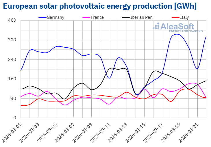 For the week of March 23, AleaSoft Energy Forecasting’s solar energy forecasts point to higher production in the Italian and Spanish markets. In contrast, production will fall in the German market.