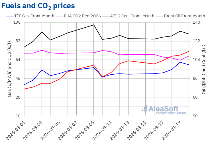 AleaSoft Energy Forecasting, March 23, 2026. During the third week of March, prices in most major European electricity markets registered an upward trend at the beginning of the week, although the weekly average fell compared to the previous week in most markets due to price declines at the end of the week. Photovoltaic energy production increased and wind energy production grew in the Iberian Peninsula and Italy, while electricity demand declined. Brent futures reached their highest level since July 2022 and TTF gas futures since January 2023, while CO₂ futures registered their lowest price since April 2025.