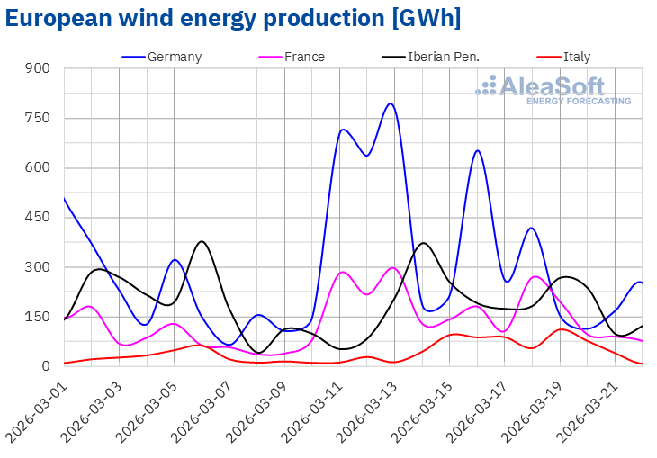 For the last week of March, AleaSoft Energy Forecasting’s wind energy forecasts indicate higher production in the Iberian Peninsula, Italy and Germany. In contrast, the French market will register declines in wind energy production.