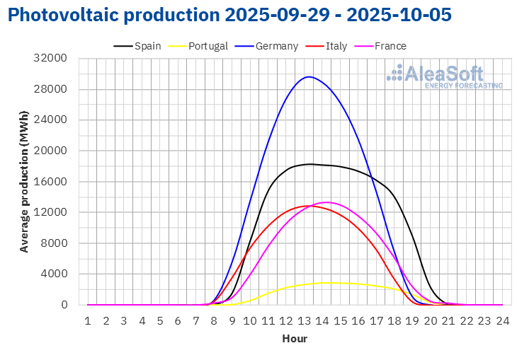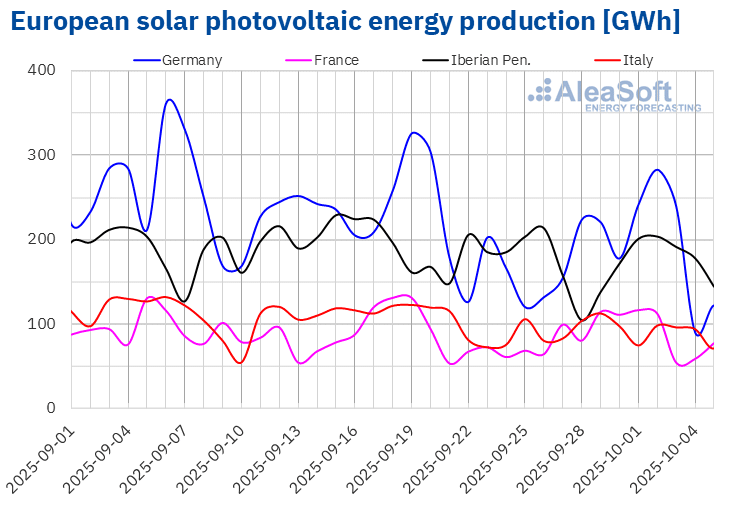 During the week, the main European markets reached record‑high photovoltaic energy production for a day in October. The French market registered its record on October 1, with a generation of 117 GWh. The following day, October 2, the German, Spanish and Italian markets registered their records, generating 283 GWh, 181 GWh and 98 GWh, respectively. The Portuguese market set its record on Friday, October 3, with a generation of 23 GWh.