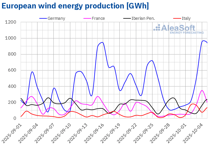 During the week, the Italian, German and French markets reached historic records for wind energy production for a day in October. The Italian market registered its highest daily generation on Thursday, October 2, with 171 GWh. The German and French markets registered their highest daily levels for October on Saturday, October 4, with 953 GWh and 349 GWh, respectively.